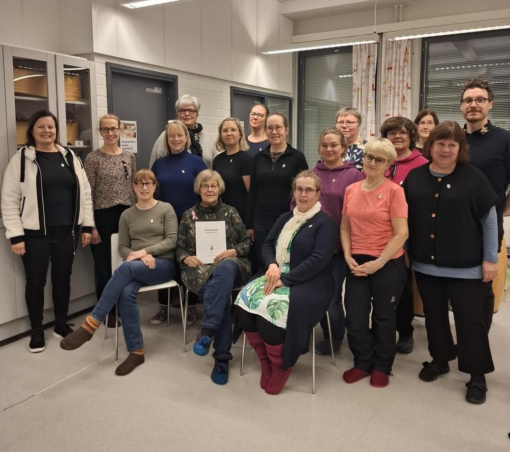 Suomenmaa-merkkilaulujen suorittajat iloitsivat saavutuksistaan lokakuussa tenttisuoritusten jälkeen. Kaikkiaan 18 laulajaa suoritti kvarteteissa hyväksytysti Suomen Naiskuoroliiton isänmaalliset merkkilaulut.